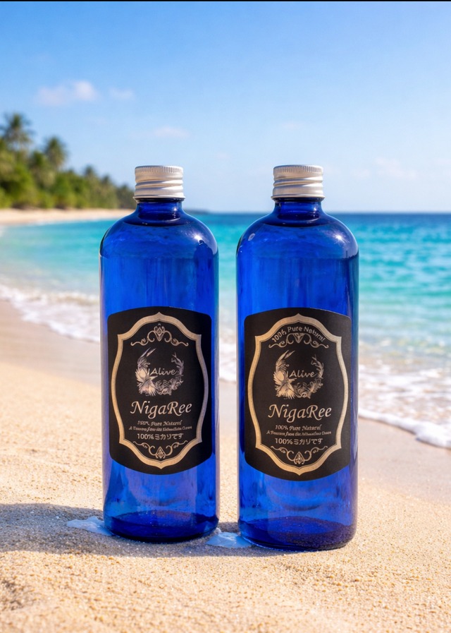Aliveのにがり NigaReeの特徴 1.ミネラルの *経皮吸収効率* を高めたミネラルバランスを誇ります。 2.一般家庭風呂(200ℓ)に5%前後のにがり濃度にすることにより保湿効果抜群の温泉風呂に変身します。(30~50㎖がお勧め) 3.皮膚の保湿成分「セラミド量」が1.5~2倍に増えることが報告されております。(37~39.5度の湯8分~20分) 4.肌荒れ・打ち身・捻挫・神経痛・肩こり・アトピー・ニキビ・吹き出物等に良いとの論文も多くあります。 5.緩やかな皮膚からのにがり成分(主にマグネシウム)吸収は高血圧・高脂血症・糖尿・肥満・ストレス緩和・自律神経等の生活習慣病に幅広く結果報告があります。 6.コップ半の水にほんの1~3滴(0.5ml)うがいで風邪予防・歯周病・虫歯予防。苦さが大丈夫な方は、歯ブラシに原液を1滴たらし歯磨きしてみて下さい。口臭にも実感が得られます。 7.コーヒー・お茶・紅茶・ジュース等にも気軽に にがりの効果効能の一般的情報。 1.整腸 2.美肌・美髪 3.アレルギー性鼻炎 4.アトピー性皮膚炎 5.骨粗鬆症 6.高血圧異常 7.不整脈 8 保温 保湿性 9肌荒れ予防 10うがい風邪予防 11歯周病 12口臭予防 13自律神経 うつ ☆下痢や低血圧によるふらつきが起きたら取りすぎです。使用中止や医師への相談、更に薄めて使用等注意しましょう。 ☆1合の米炊飯・煮込み料理・炒め料理の時0.2g(2~3滴)1日10~20滴(0.5ml~1ml)を目安