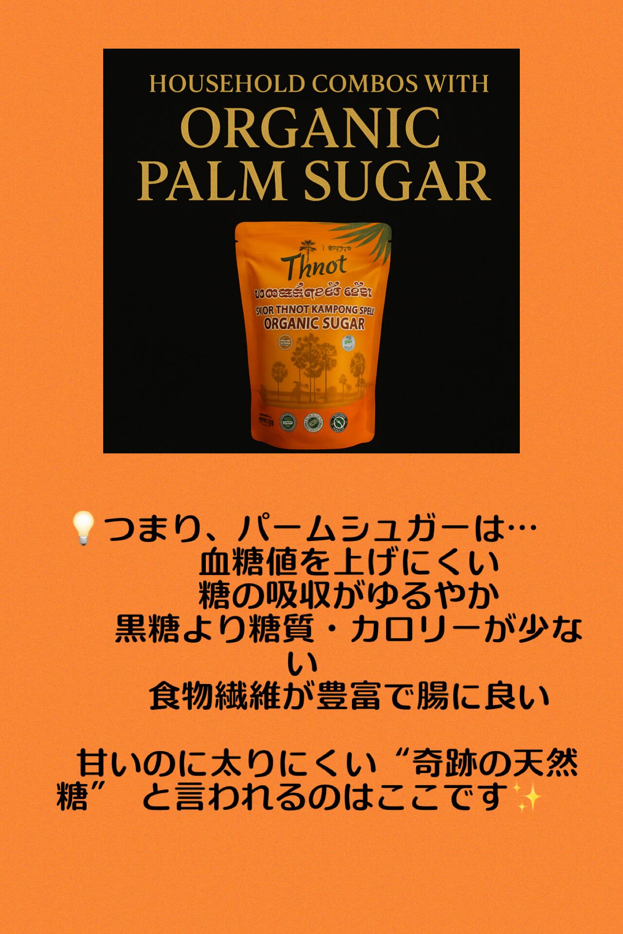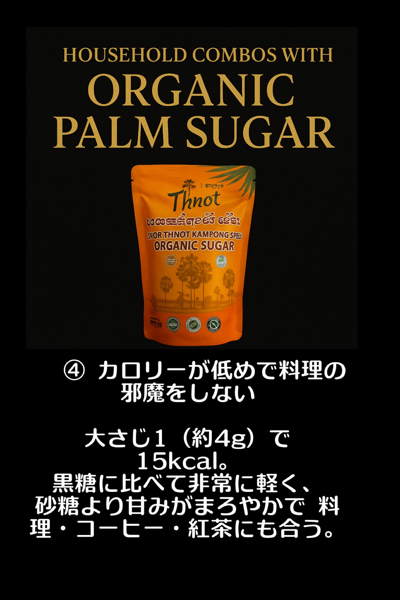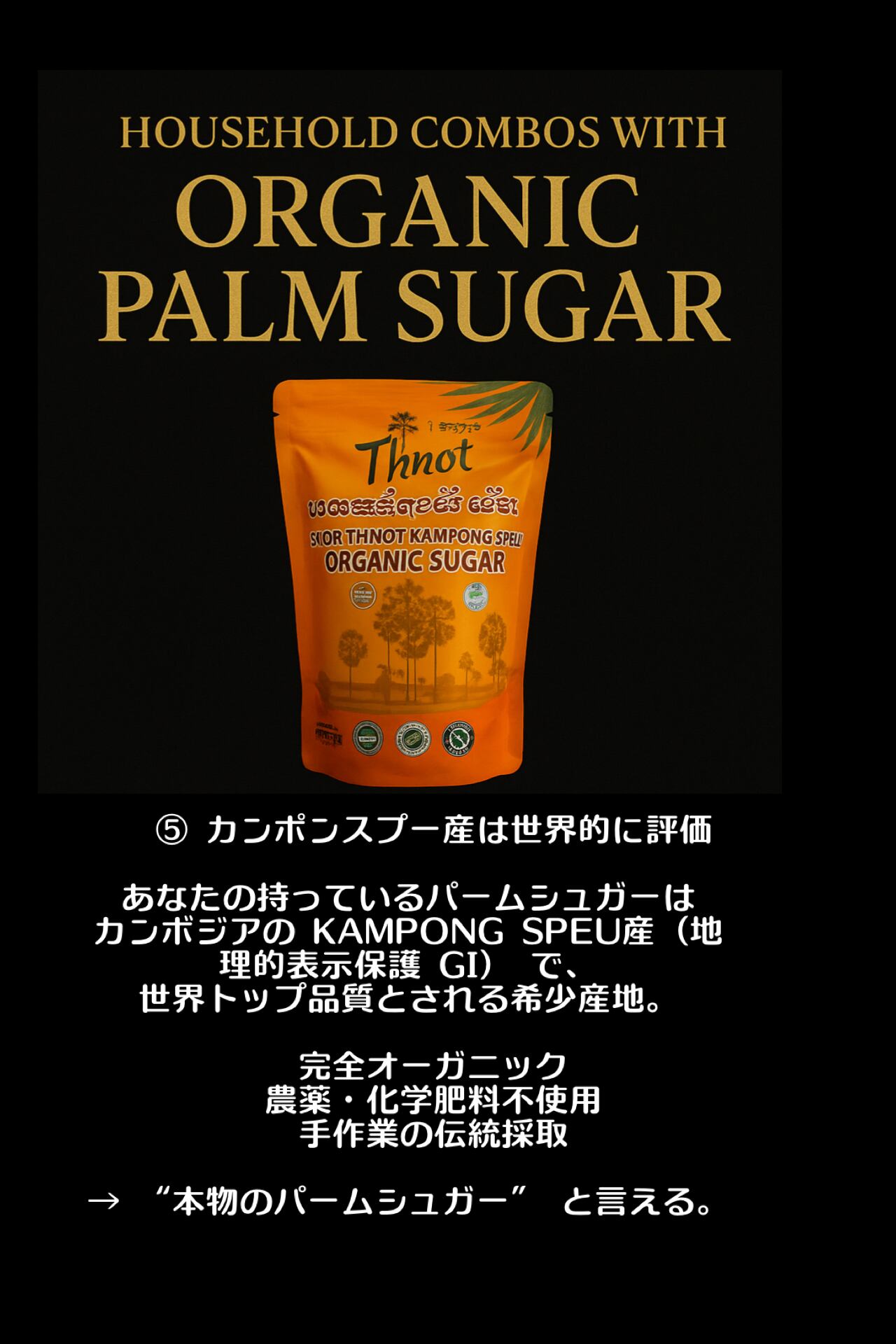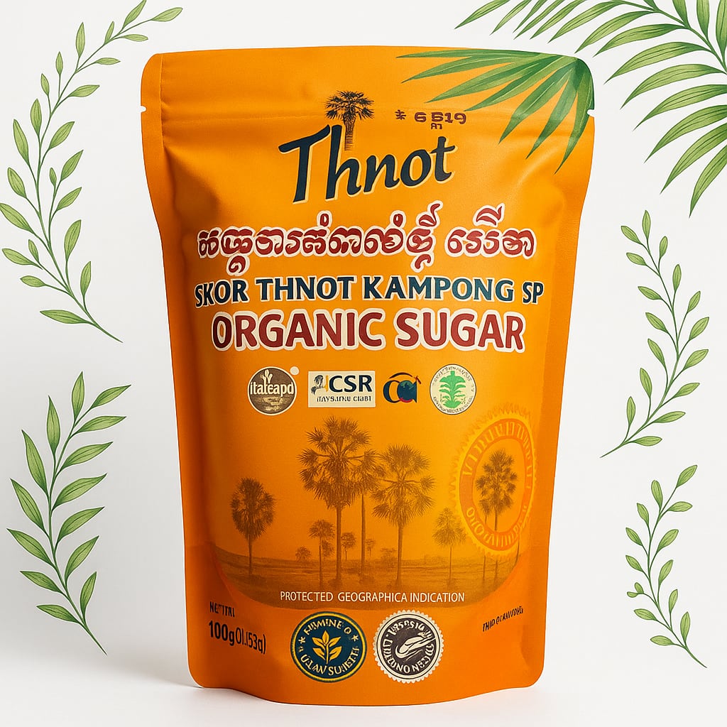 カンボジアの伝統農法でつくられる、ヤシの花序や幹などの樹液を煮詰めて作られる茶褐色のコクのある砂糖です。