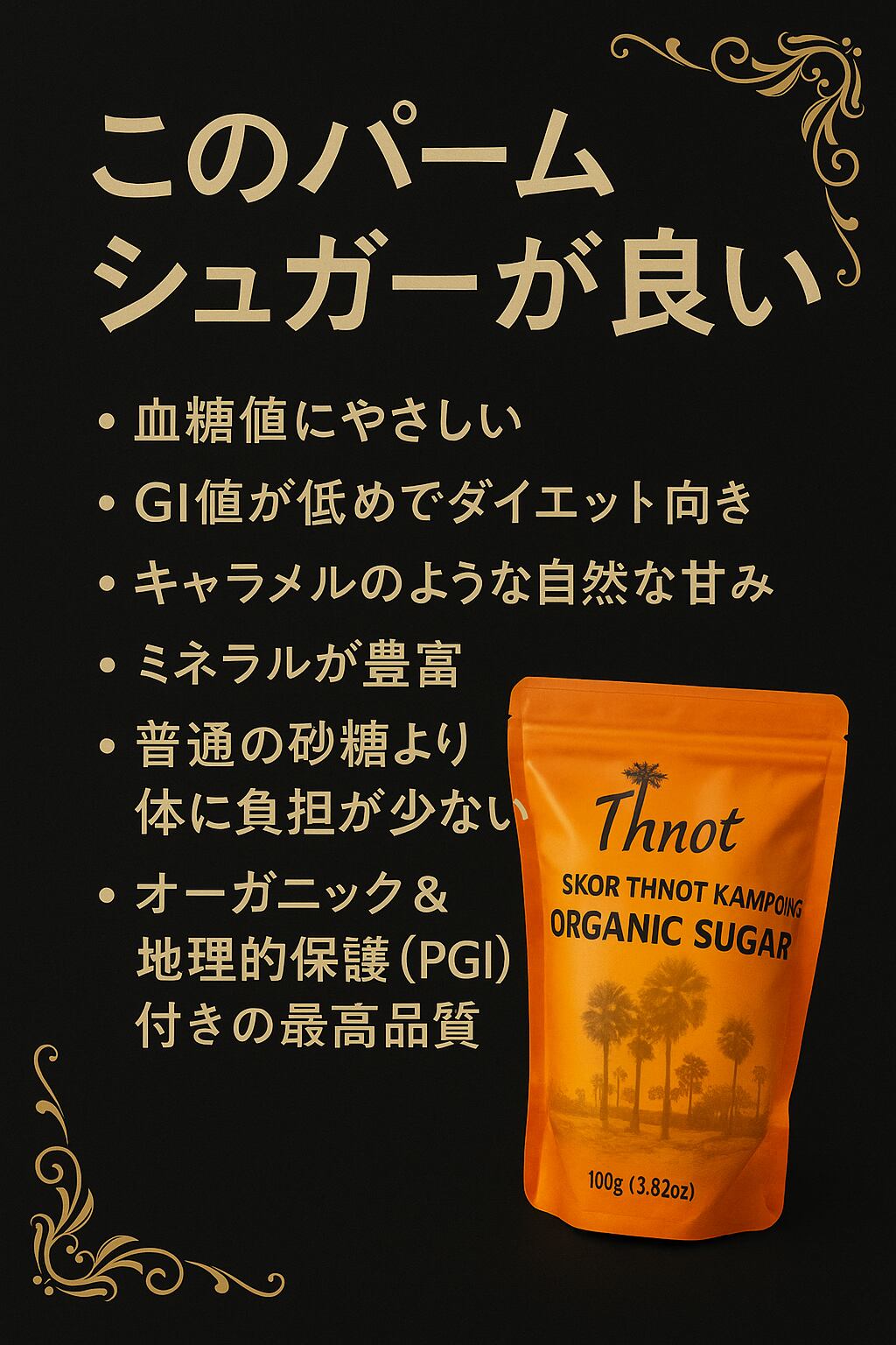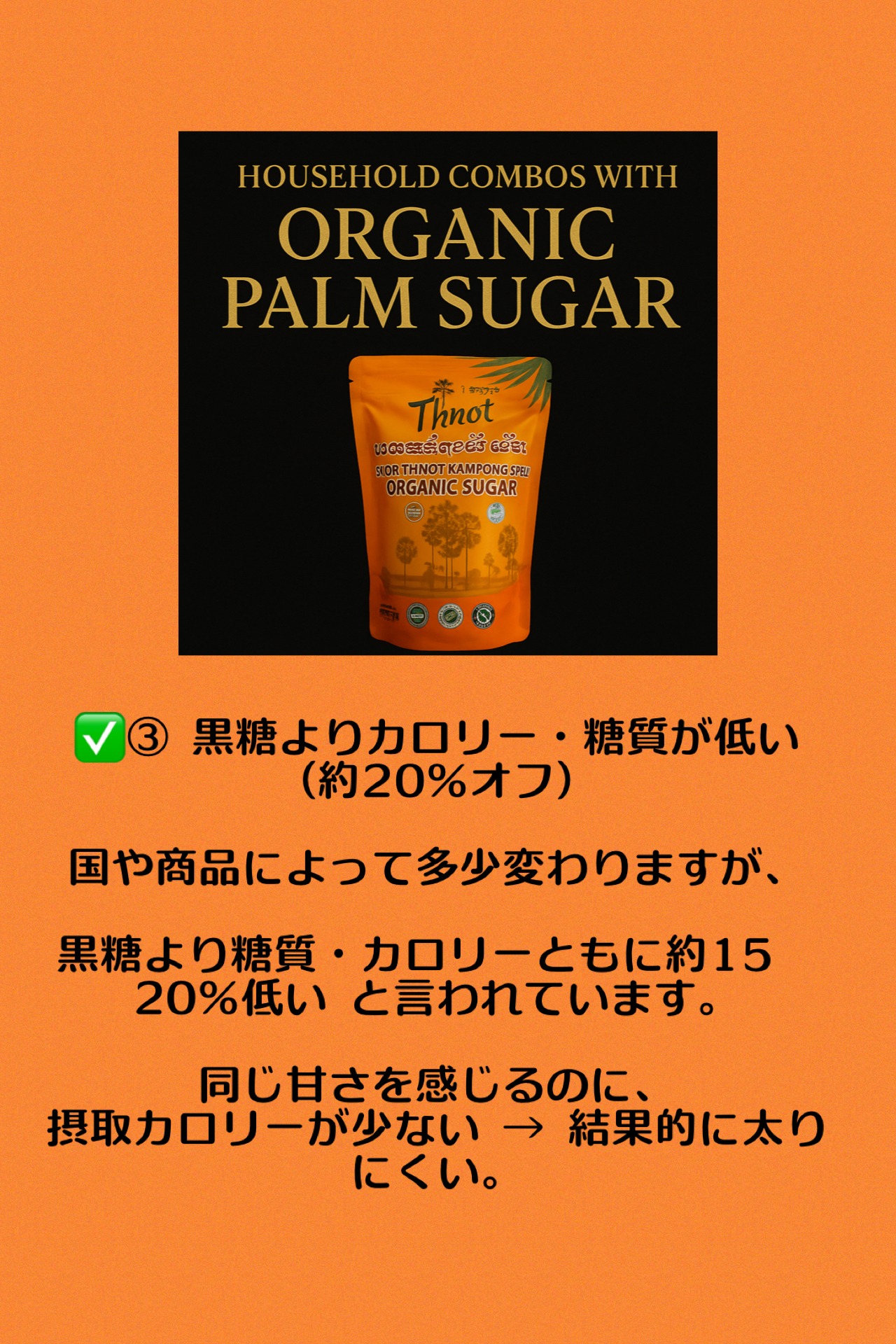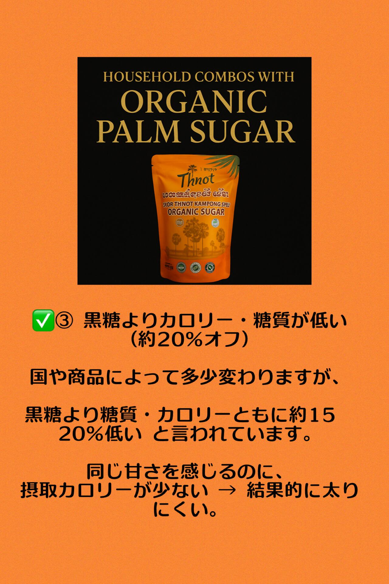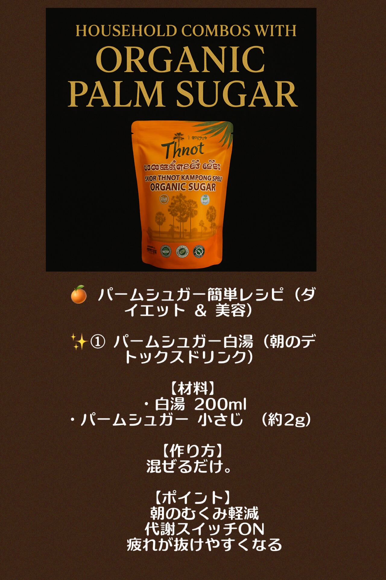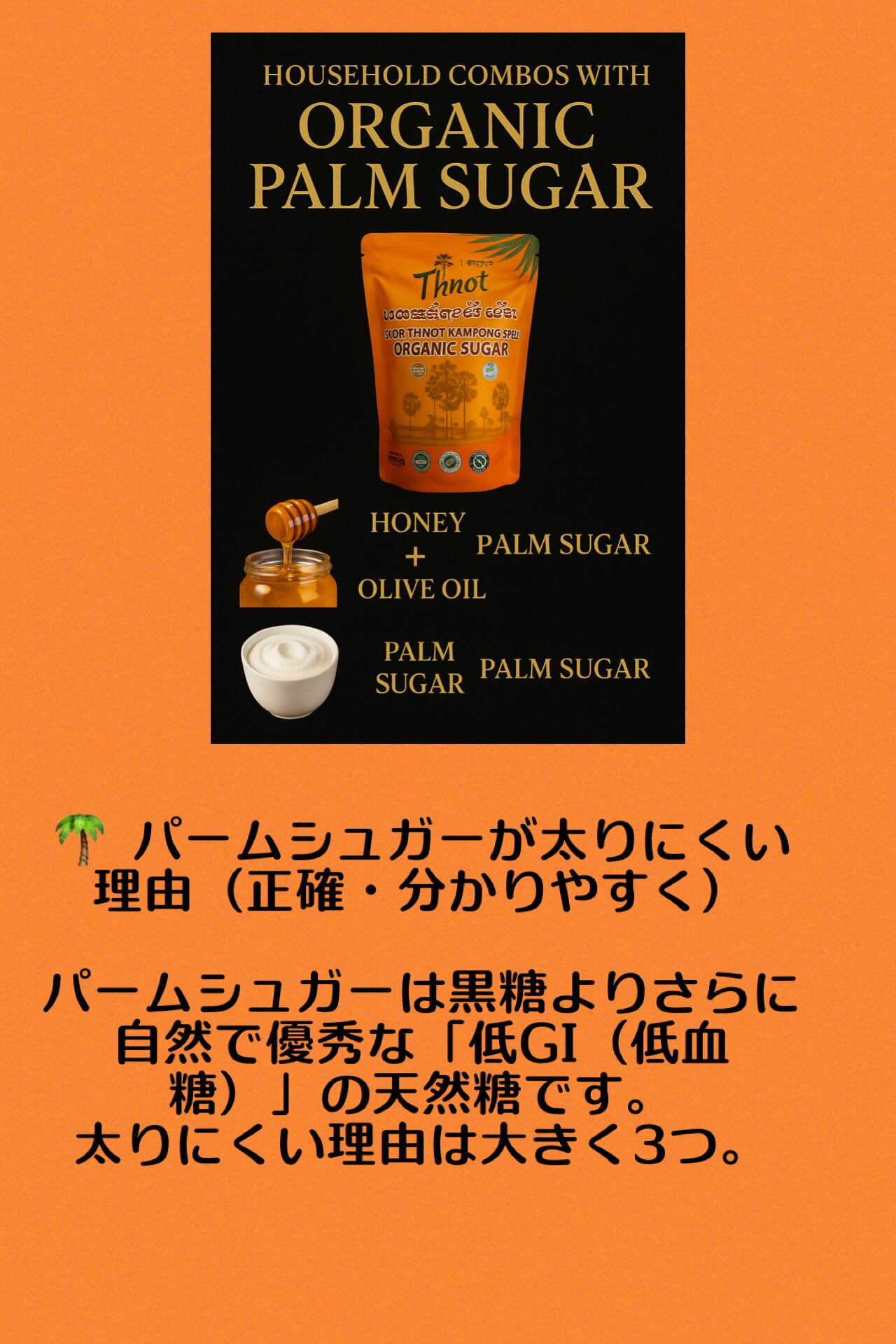 カンボジアの伝統農法でつくられる、ヤシの花序や幹などの樹液を煮詰めて作られる茶褐色のコクのある砂糖です。