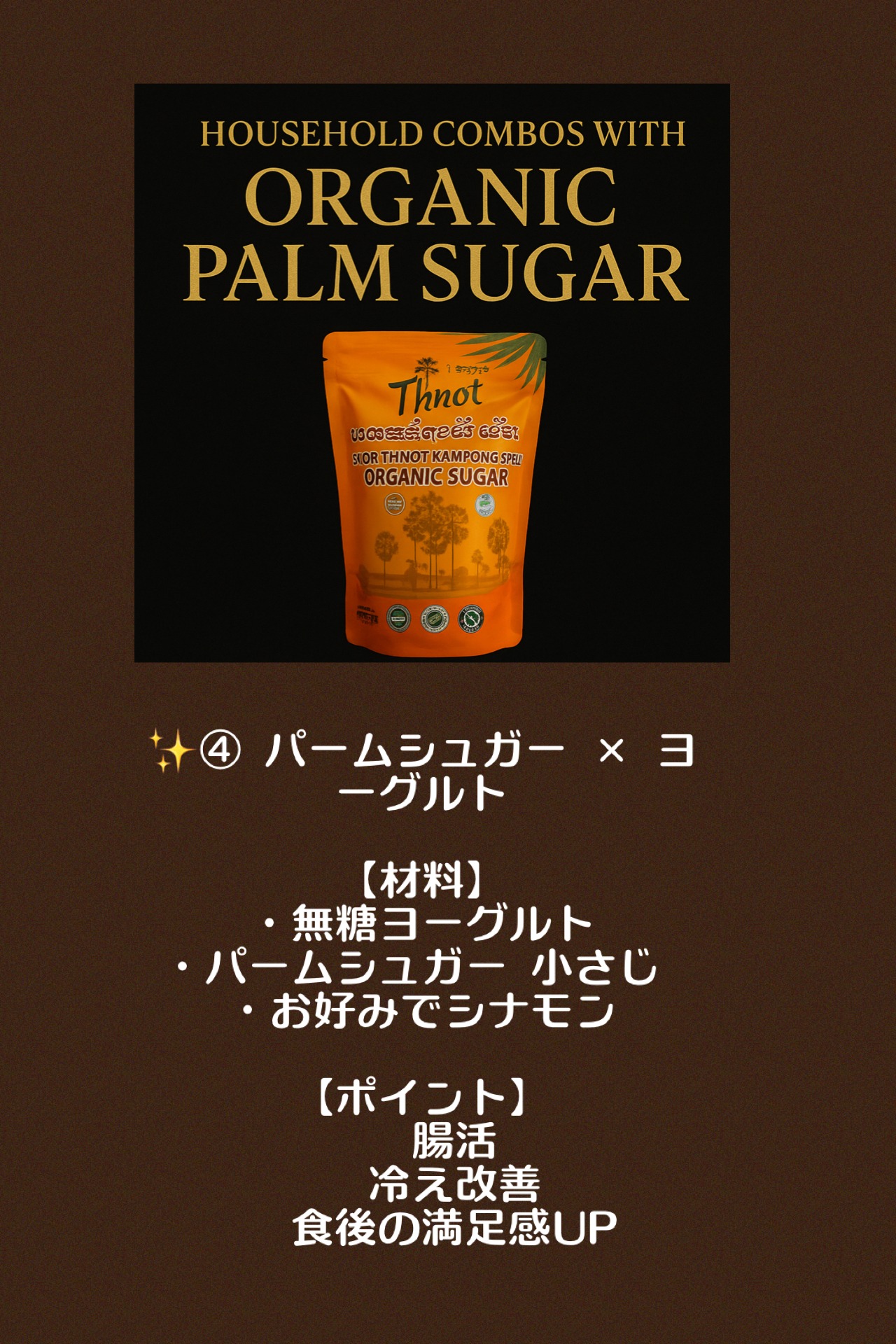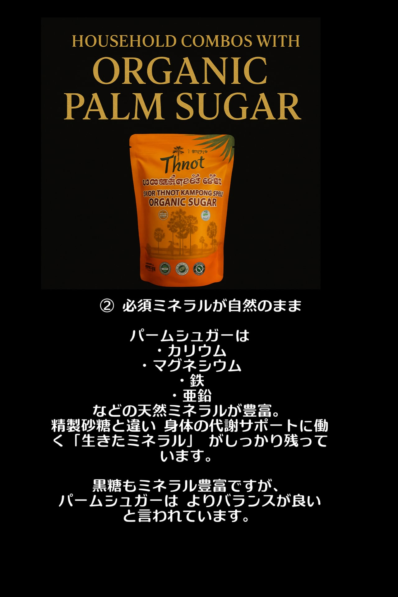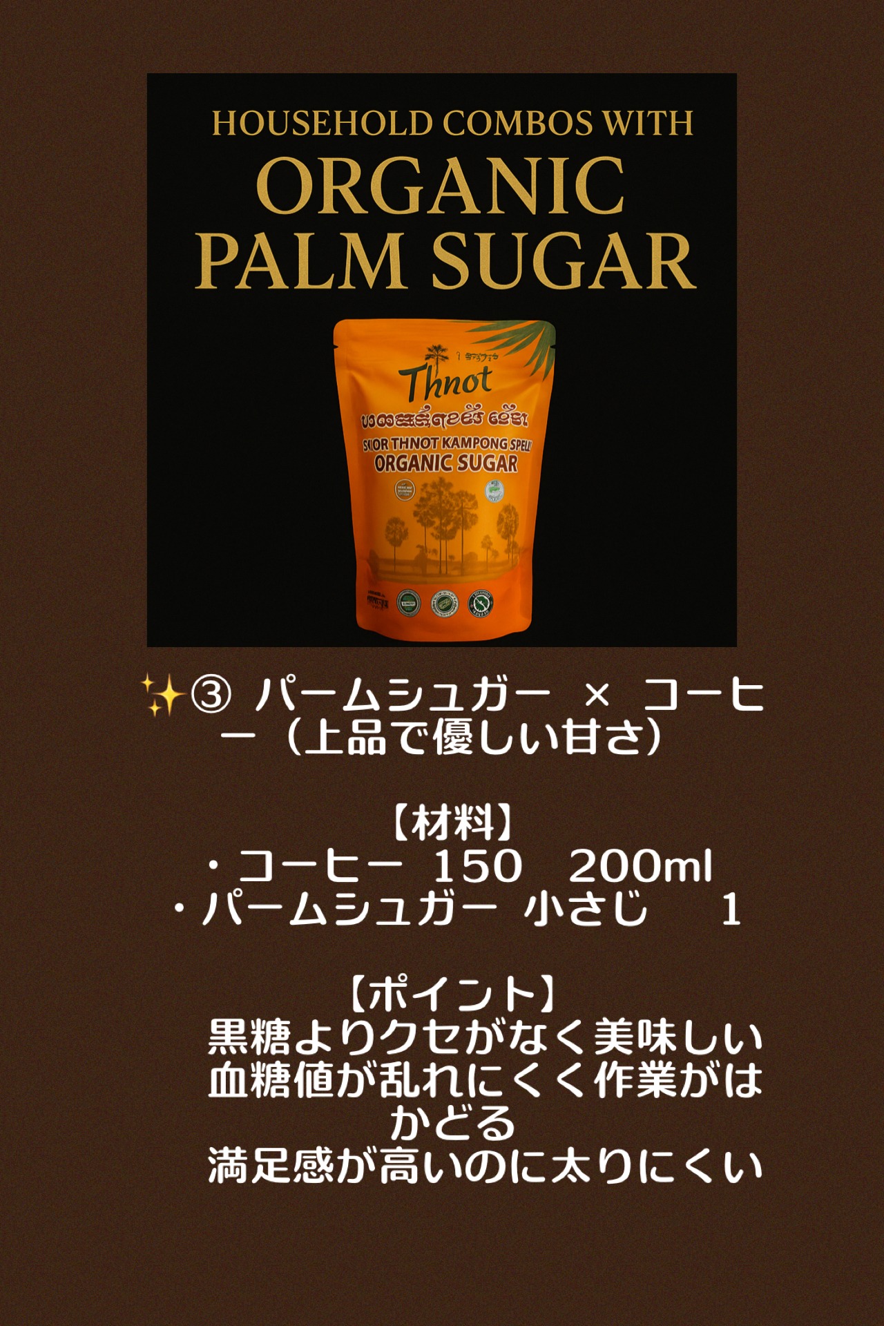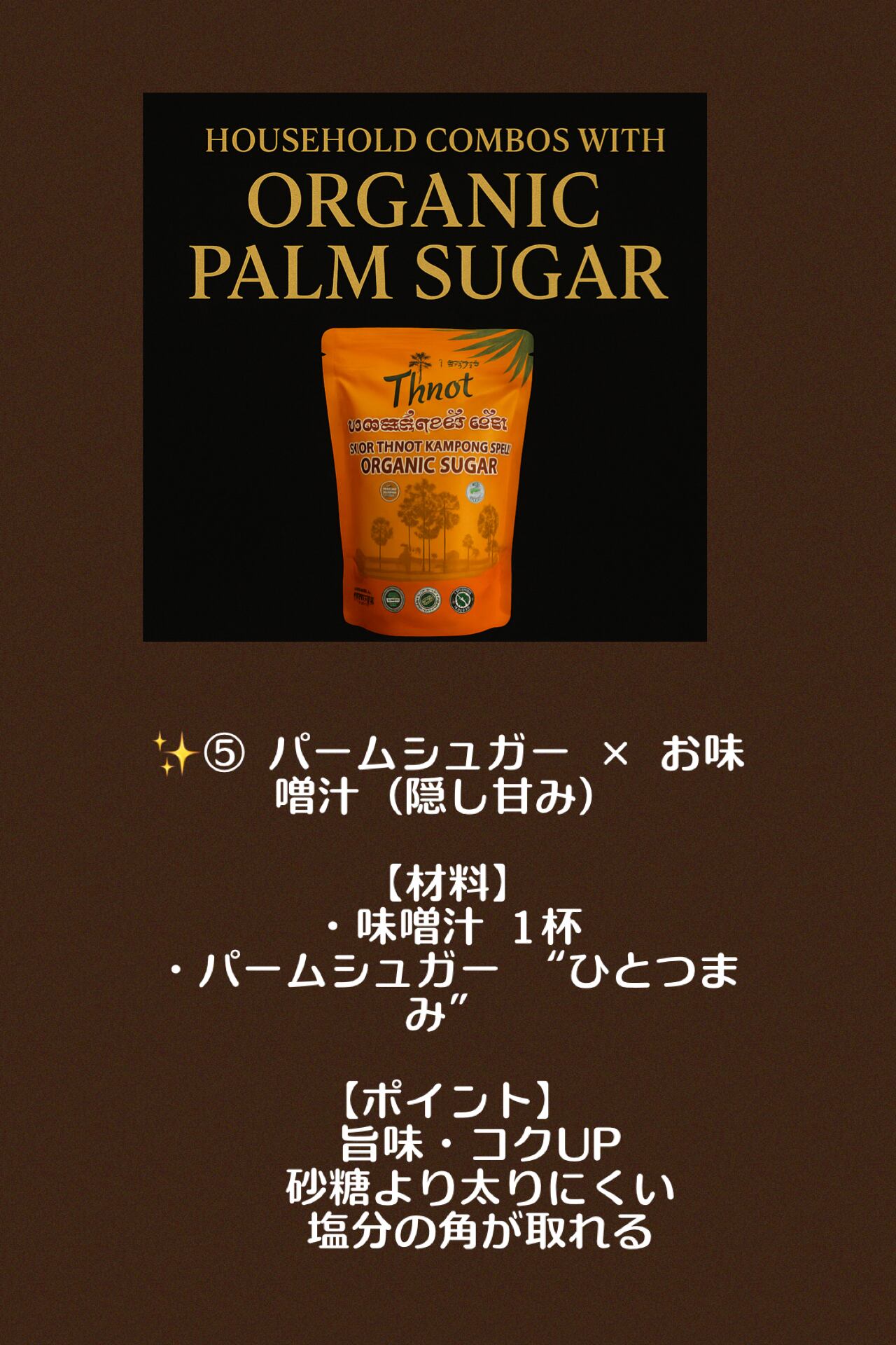 カンボジアの伝統農法でつくられる、ヤシの花序や幹などの樹液を煮詰めて作られる茶褐色のコクのある砂糖です。