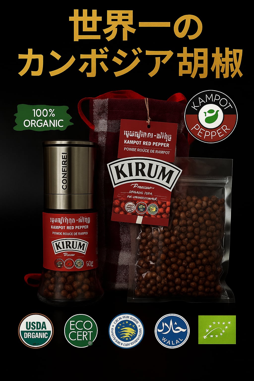 SALE❣️世界1のカンボジア、カンポットレッドペッパーの袋詰め50gとミル30gのセット