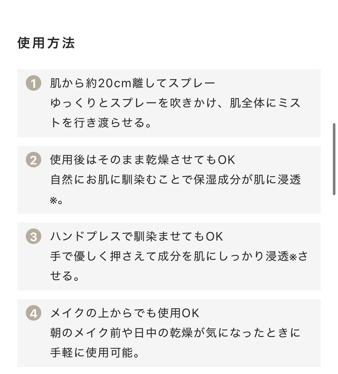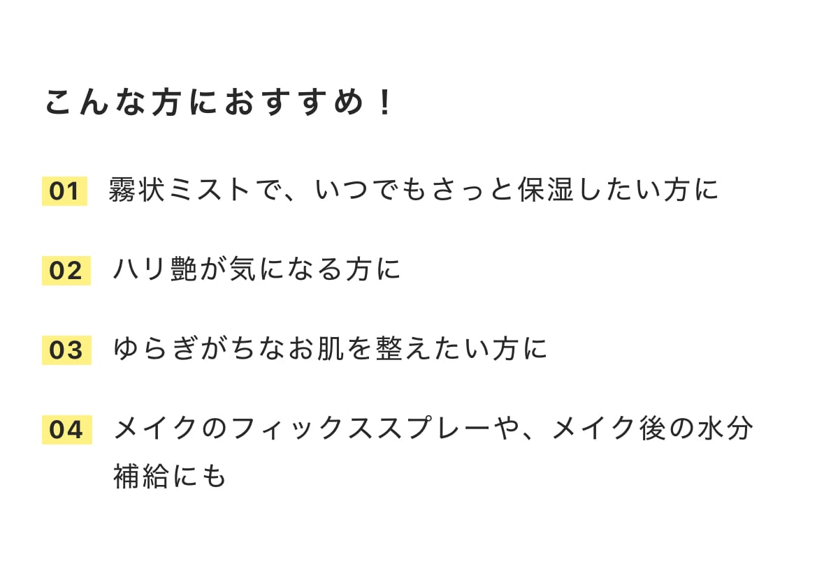 このミストは、ひと吹きで潤いを届ける超微細ミスト処方。